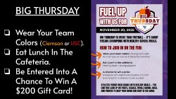 Eat Lunch In The Cafeteria & You’ll Be Entered Into A Drawing For $200! Also, Wear Clemson Or Carolina Gear To Show Who You Support In The Historic Rivalry Between The Two Schools!