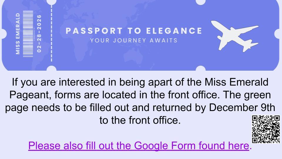 If you are interested in being apart of the Miss Emerald Pageant, forms are located in the front office. The green page needs to be filled out and returned by December 9th to the front office.